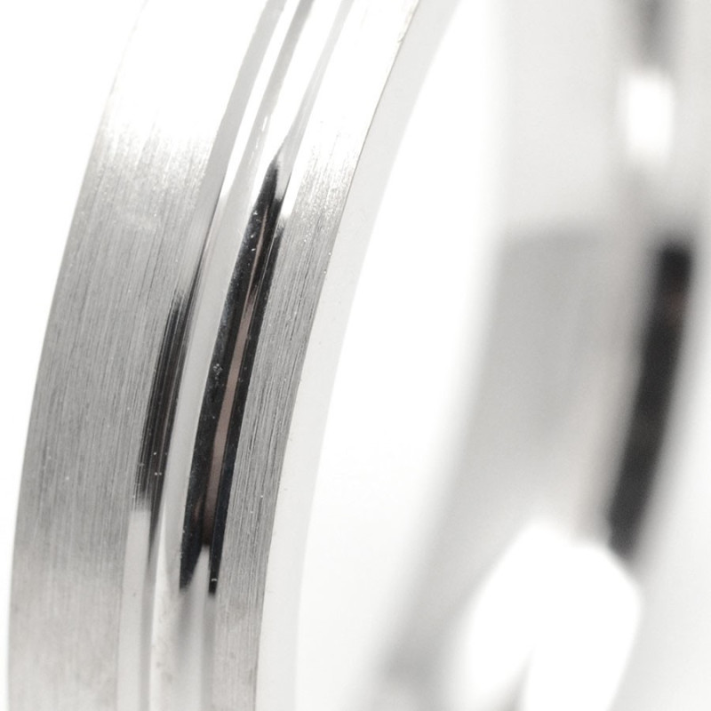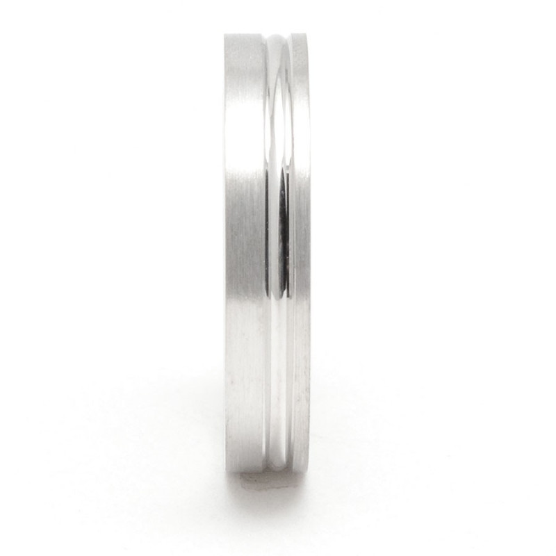 Sortija fabricada en Plata de Ley. Adornada por un surcos en brillo que la cruza. Ancho: 4 mm. Alto: 2 mm.