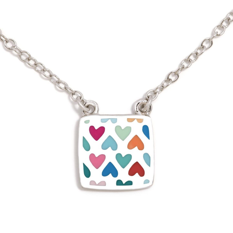 Colgante fabricado en Plata de Ley. Formado por una fina cadena de plata de la que cuelga un colgante con forma de cuadrado esmaltado. Cadena ajustable a distintas medidas entre 40 cms y 45 cms.