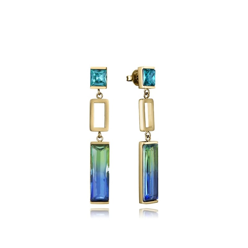 Unos pendientes que irradian elegancia y frescura con cada destello. Elaborados en acero con un acabado IP dorado, presentan cristales verdes y azules que aportan un brillo vibrante y sofisticado. El diseño colgante añade movimiento y ligereza, creando una pieza única que captura la luz de manera espectacular. Con un largo de 5 cm, estos pendientes ofrecen la medida perfecta para realzar cualquier look con un toque de color y distinción. Una joya ideal para mujeres que buscan un accesorio moderno, lleno de vida y elegancia.