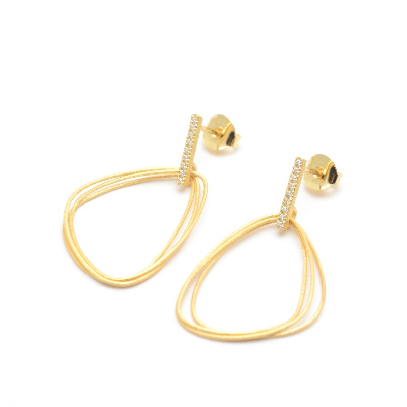 Pendientes fabricados en Plata de Ley con baño de oro. Formados por una barrita del que cuelgan dos aros irregulares frontales. Ajuste de presión. Altura: 40 mm.