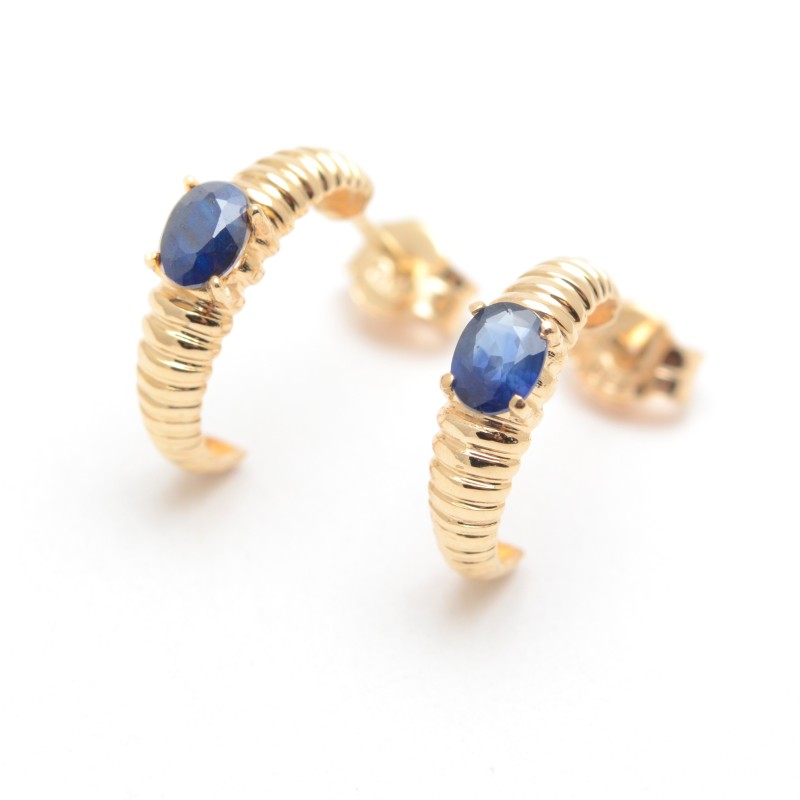 Pendientes fabricados en Oro de Ley de 18K. Con forma de media griolla agallonada engarzada con un zafiro auténtico. Ajuste de presión. Altura: 12 mm.