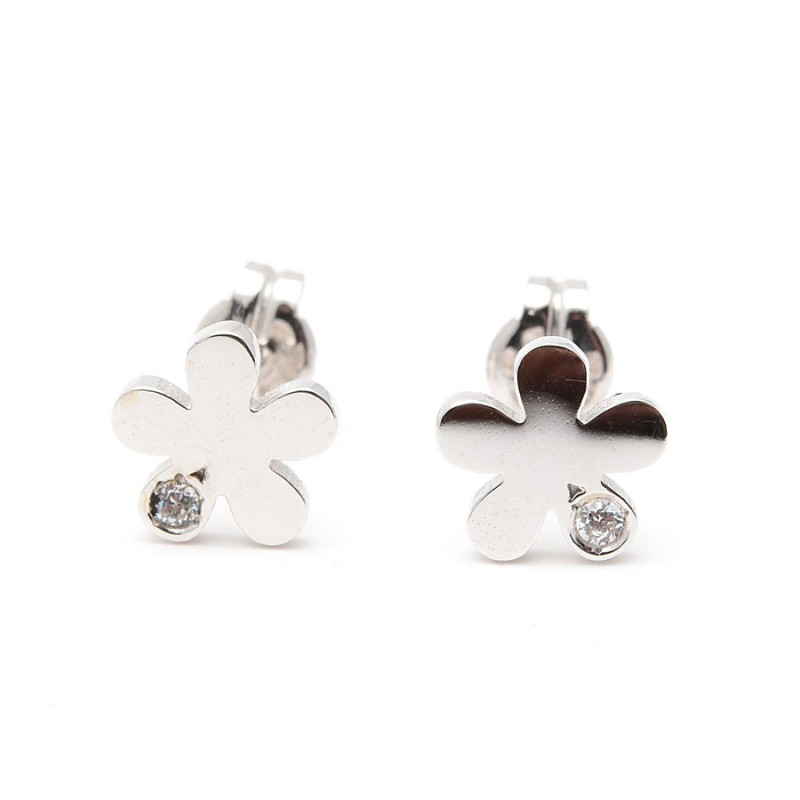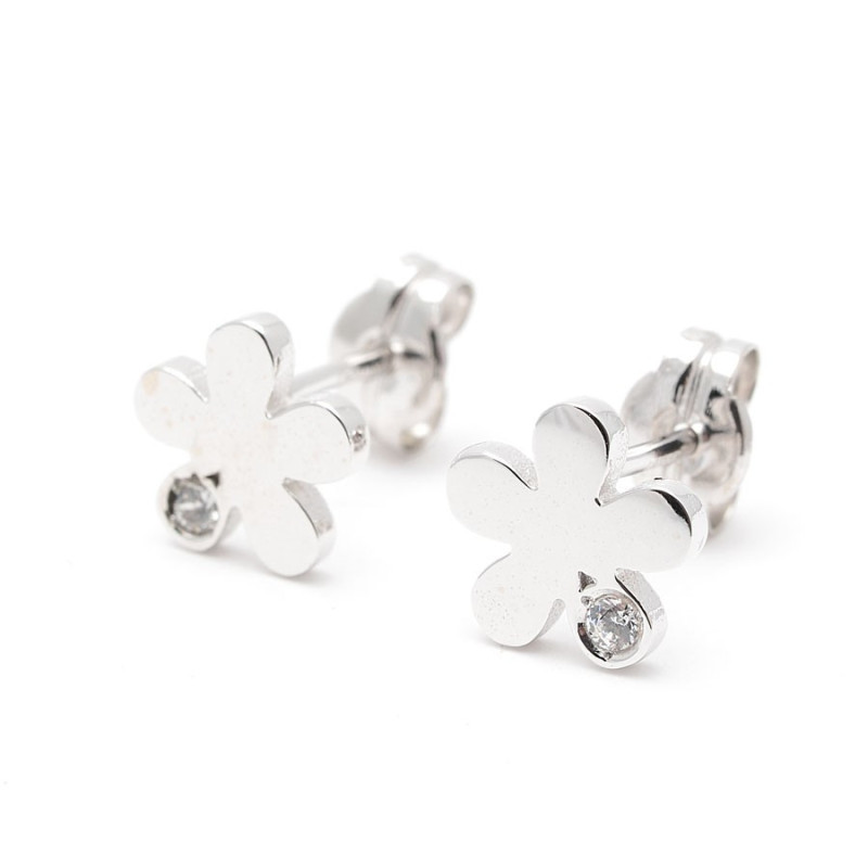 Pendientes fabricados en Oro Blanco de Ley de 18 kilates con forma de flor. Con una circonita engarzada en uno de sus pétalos. Ajuste de presión. Diámetro pendientes: 7 mm.