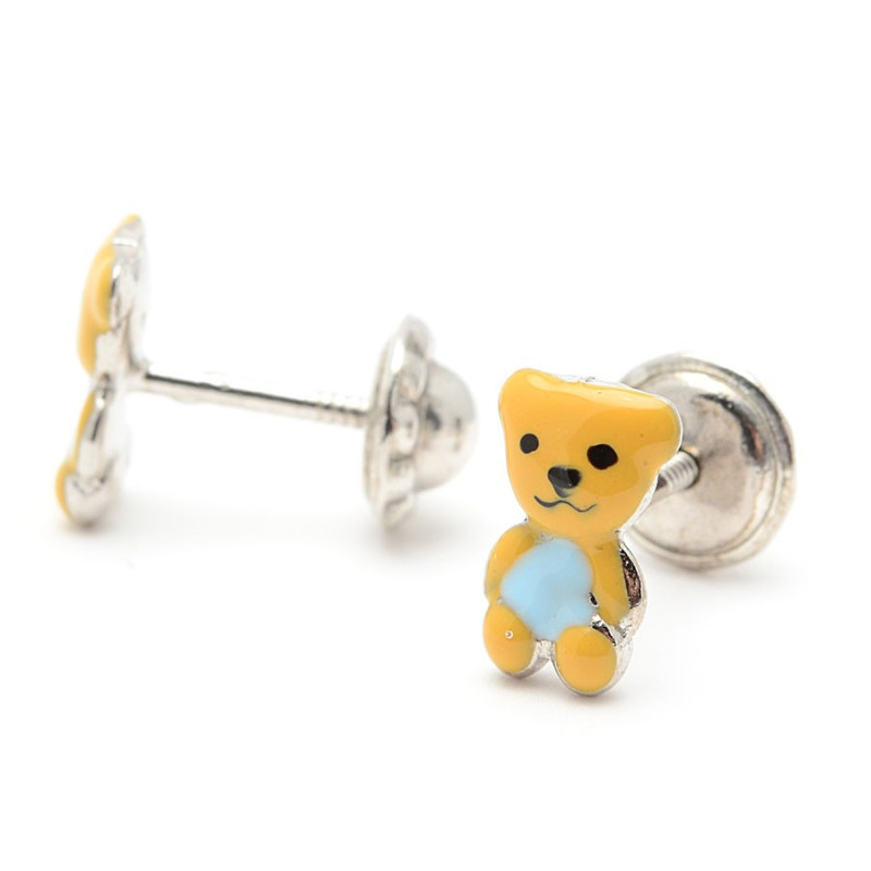 Pendientes para niña fabricados en Plata de Ley de 925 milésimas. Con forma de osito con esmalte de color. Ajuste de rosca. Medidas: 8 mm x 5 mm.