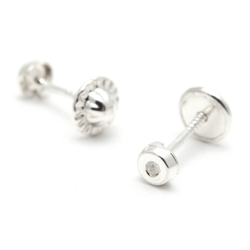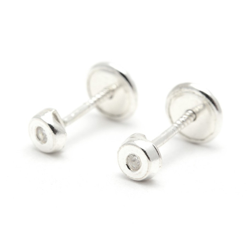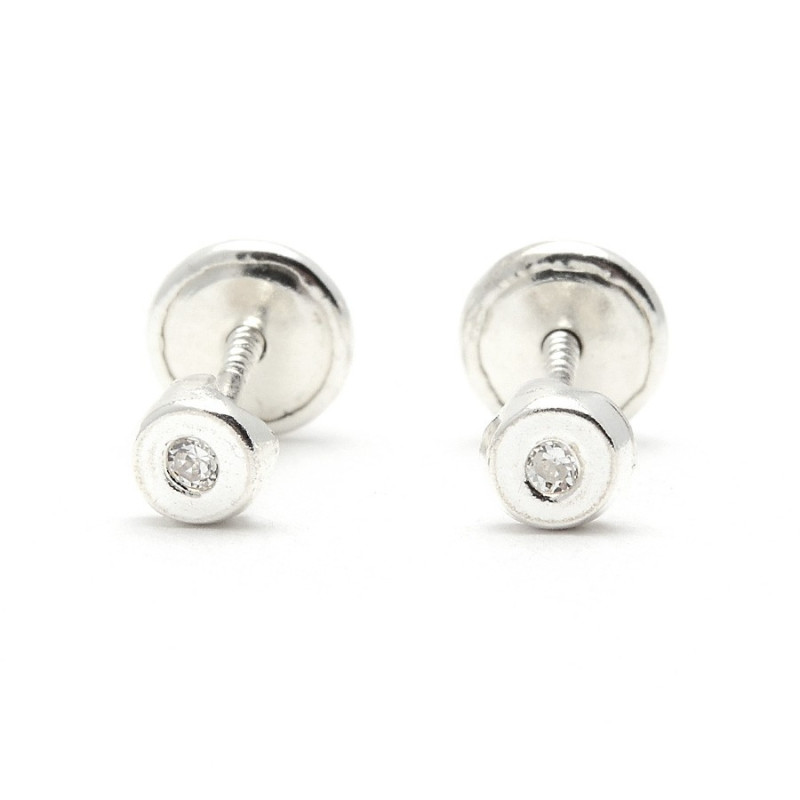 Pendientes fabricados en Plata de Ley. Con un pequeño círculo engarzado con una circonita en el centro. Ajuste de rosca. Diámetro: 3.5 mm.