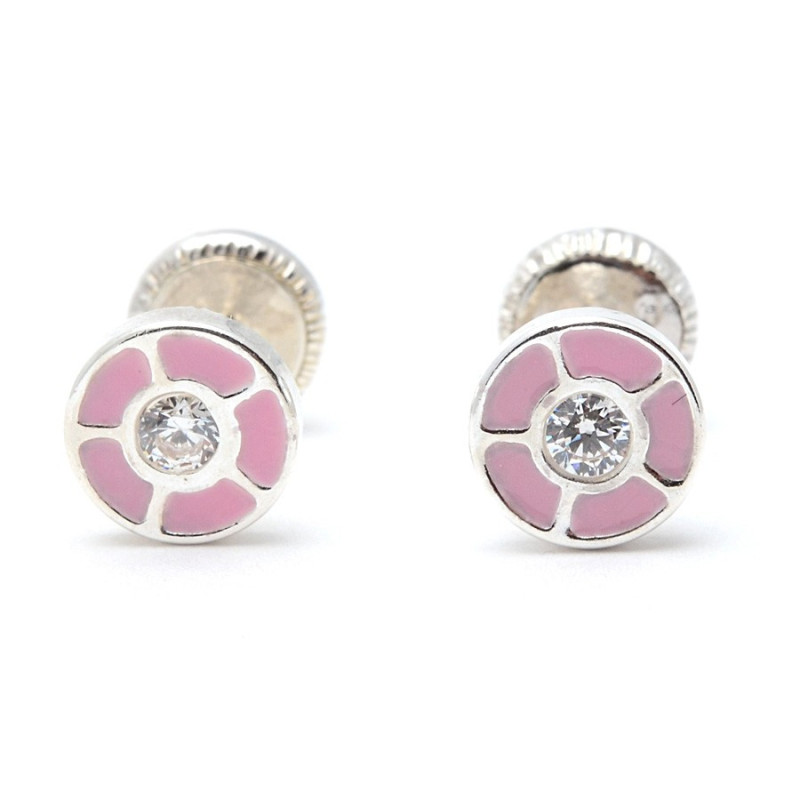 Pendientes fabricados en Plata de Ley. Con forma de círculo esmaltado en color rosa con una circonita en el centro. Ajuste de rosca. Diámetro: 6 mm.