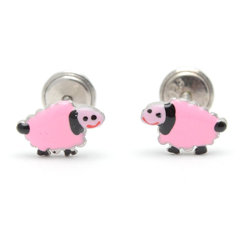 Pendientes para niña fabricados en Plata de Ley de 925 milésimas. Con forma de oveja pintada a mano con esmalte de color. Ajuste de rosca.
