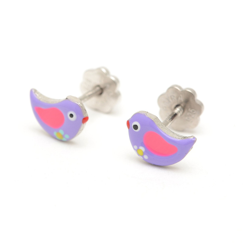 Pendientes para niña fabricados en Plata de Ley de 925 milésimas. Con forma de pajarito pintado a mano con esmalte de color. Ajuste de rosca.