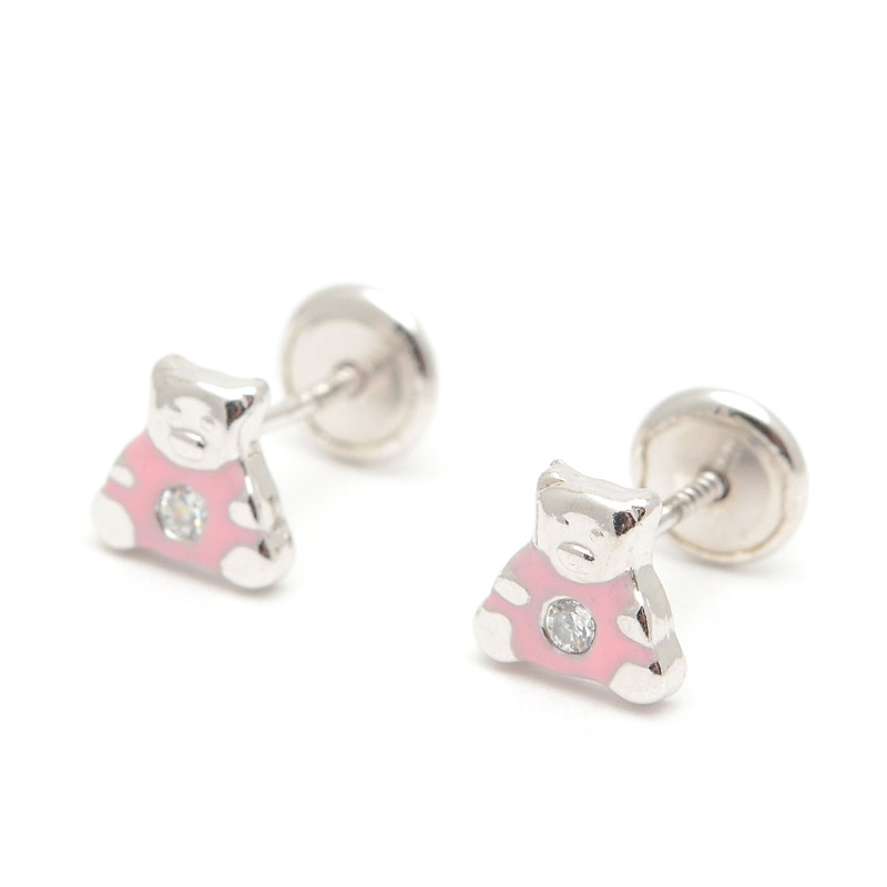 Pendientes fabricados en Plata de Ley. Con forma de osito de color rosa con una circonita engarzada en el centro. Ajuste de rosca. Diámetro: 6 mm.