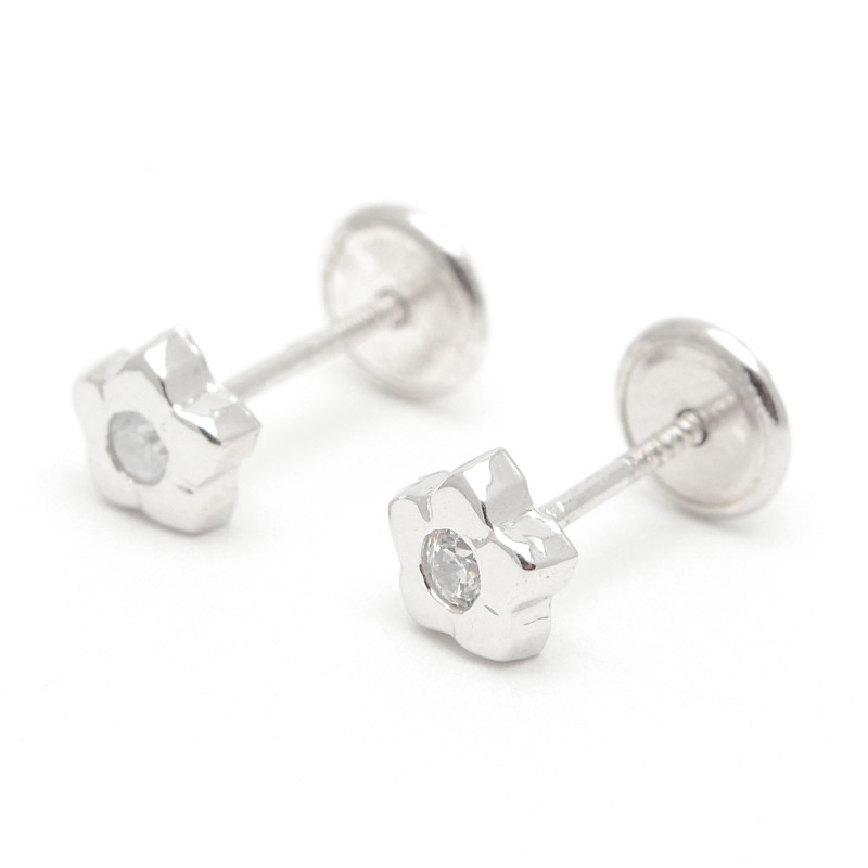Pendientes fabricados en Plata de Ley. Con forma de flor de cinco pétalos y una circonita engarzada en el centro. Ajuste de rosca. Diámetro: 5 mm.