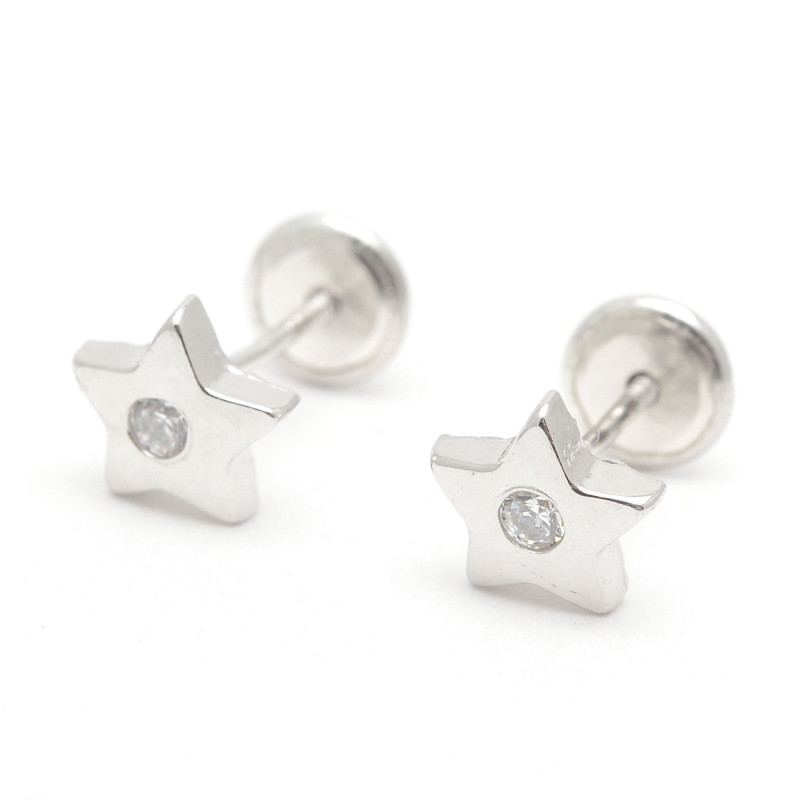 Pendientes fabricados en Plata de Ley. Con forma de estrella con una circonita engarzada en el centro. Ajuste de rosca. Diámetro: 6 mm.