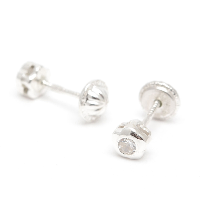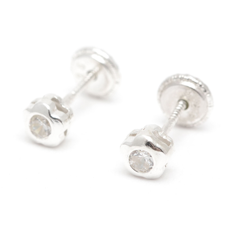 Pendientes fabricados en Plata de Ley. Con forma de flor con una circonita engarzada en el centro. Ajuste de rosca. Diámetro: 4 mm.