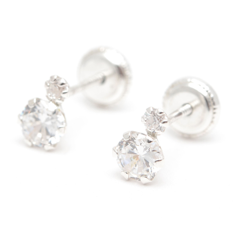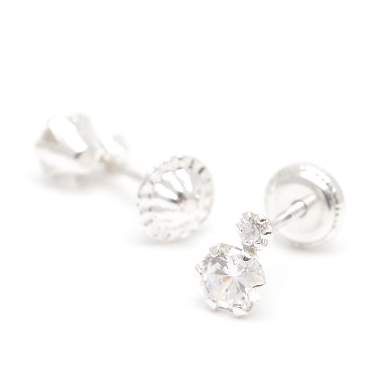 Pendientes fabricados en Plata de Ley. Formados por una circonita más grande y otra más pequeña las dos engarzadas con garras. Ajuste de rosca. Medidas: 7 mm x 4 mm.