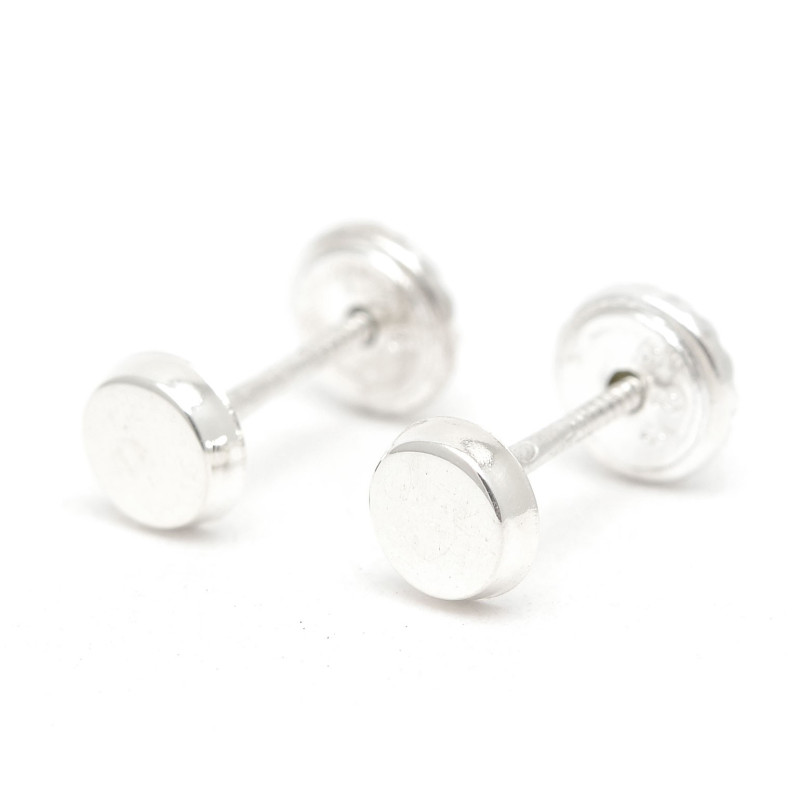Pendientes fabricados en Plata de Ley. Redondos con forma de disco liso brillate. Ajuste de rosca. Diámetro: 4 mm.