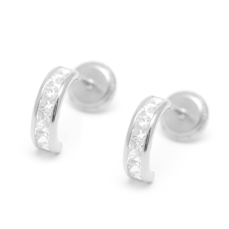 Pendientes fabricados en Plata de Ley. Con forma de pequeño aro con circonitas engarzadas en la parte delantera. Ajuste de rosca. Diámetro: 8 mm.