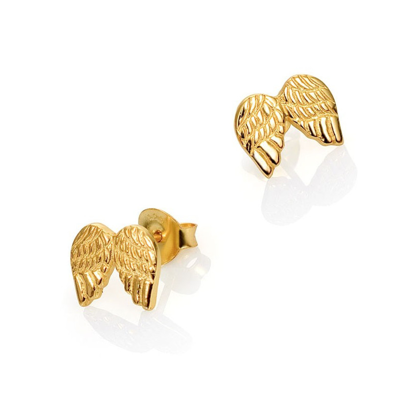 Pendientes fabricados en plata con baño de oro. Con forma de dos pequeñas alas. Ajuste de presión. Medidas: 10 mm x 10 mm.