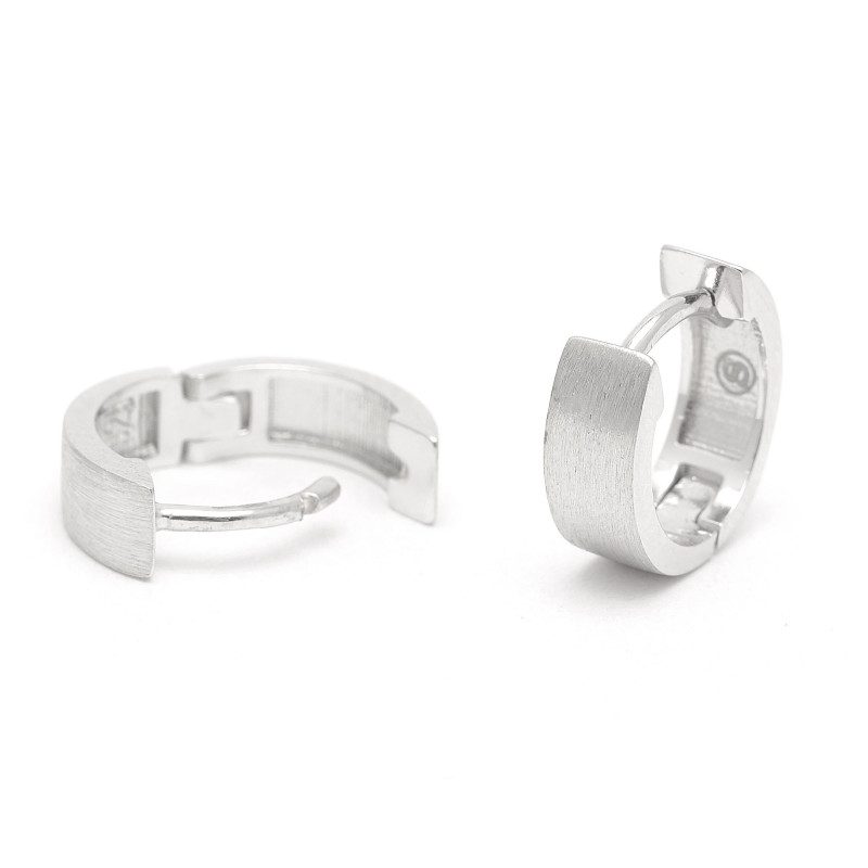 Pendientes fabricados en Plata de Ley. Con forma de aro pequeño o criolla. Cierre de bisagra. Medidas: 13 mm x 4 mm.