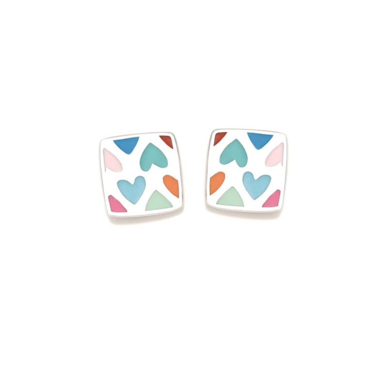 Pendientes fabricados en Plata de Ley. Con forma de cuadrado esmaltado con corazones de colores. Ajuste de presión. Altura: 9 mm.