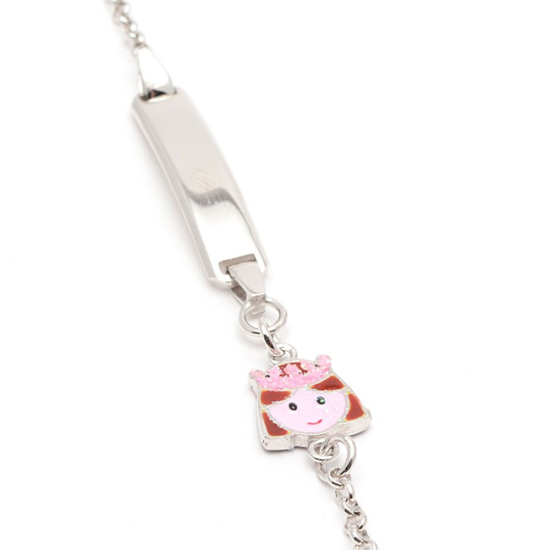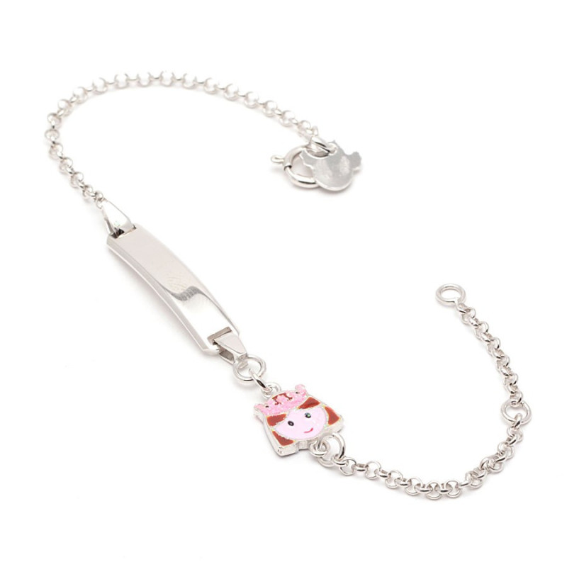 Pulsera fabricada en Plata de Ley con tratamiento antialérgico. Figurita con esmalte de color. Placa lisa para grabar el nombre. Ajustable a dos medidas 12 cms y 14 cms.