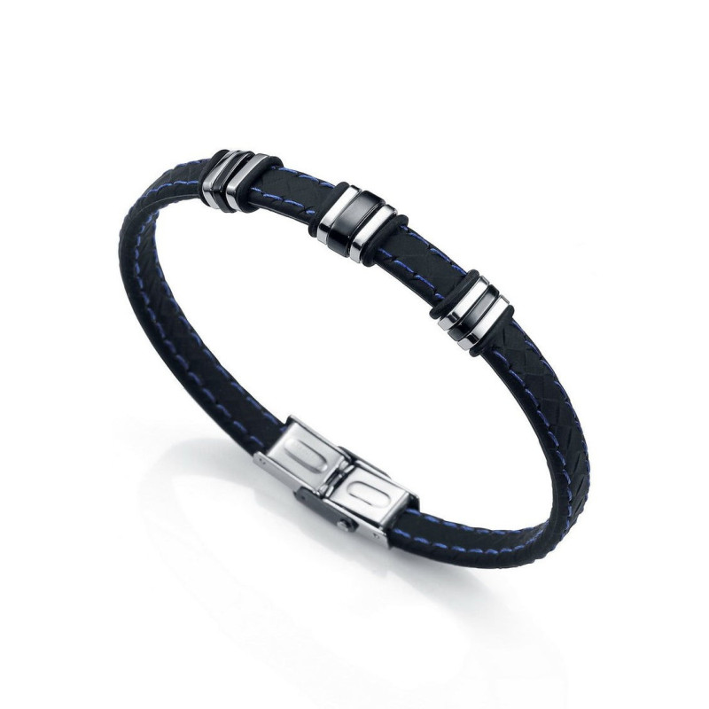 Pulsera fabricada en acero y silicona. Formada por una tira plana con el pespunte azul. Cierre de pestaña. Ajustable a distintas medidas.