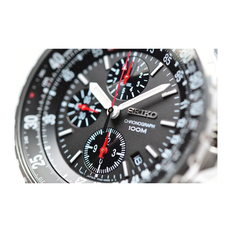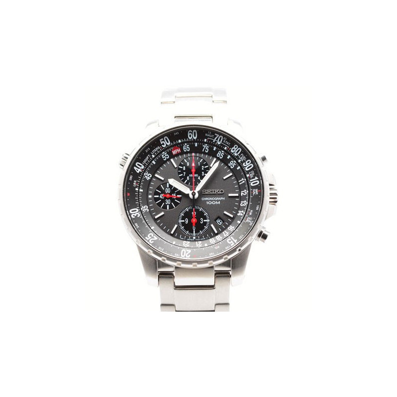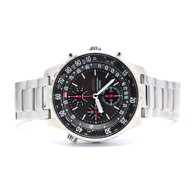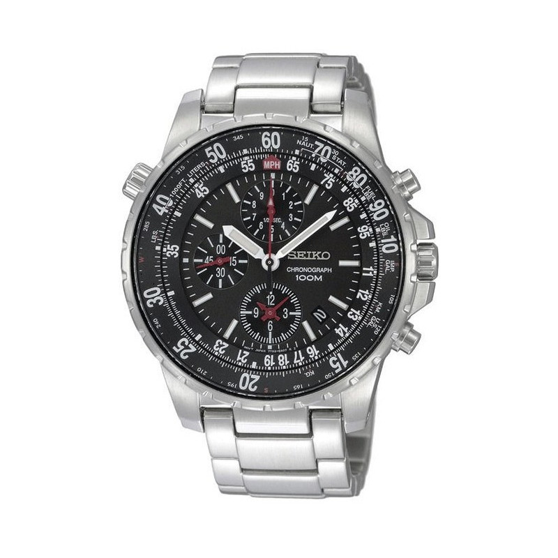 Reloj SEIKO modelo PILOT. Caja y cadena de acero inoxidable. Cristal mineral. Cronómetro y Alarma. Bisel giratorio con reglas de cálculo y conversor de unidades. Resistente al agua 10 ATM. Diámetro caja: 42mm. Altura caja: 11mm.