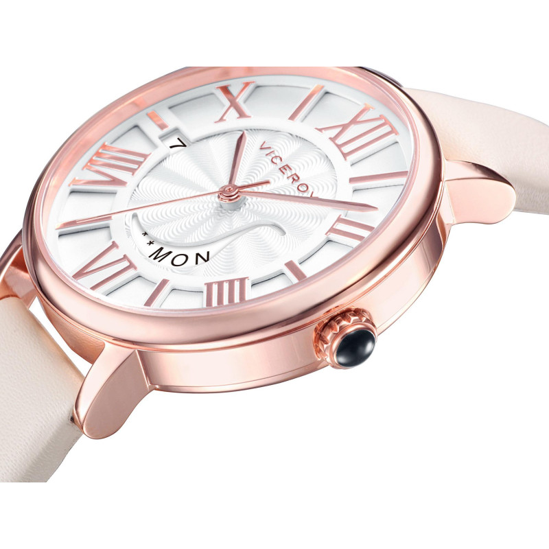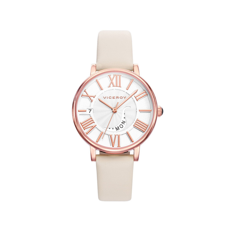 Reloj Viceroy con caja de acero con baño de oro rosa. Esfera color blanco con índices en color dorado. Calendario y semanario. Correa de piel en color beig con hebilla dorada. Diámetro: 36 mm.