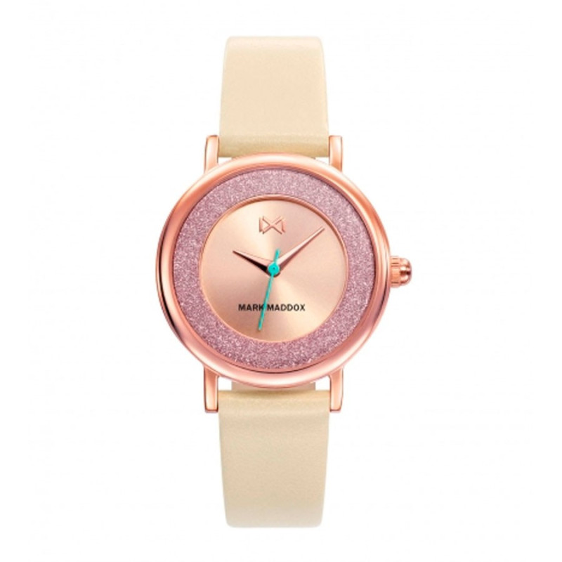 Reloj con caja de acero con baño de oro rosa. Esfera en color dorado con saetas en dorado. Correa de piel en marrón claro y hebilla dorada. Diámetro: 30 mm.
