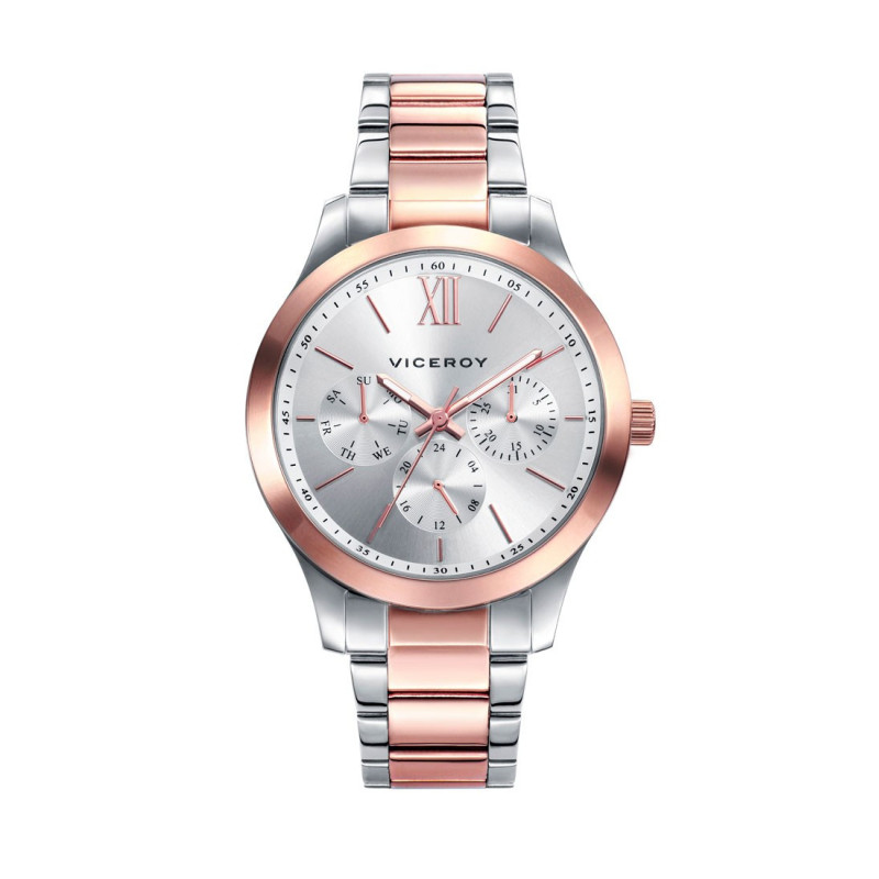 Reloj con caja y brazalete de acero bañado en oro rosa. Cristal mineral. Esfera en plateado con indicadores de semanario, calendario y hora en formato 24h. Brazalete con cierre desplegable con pulsadores. Diámetro: 38 mm.